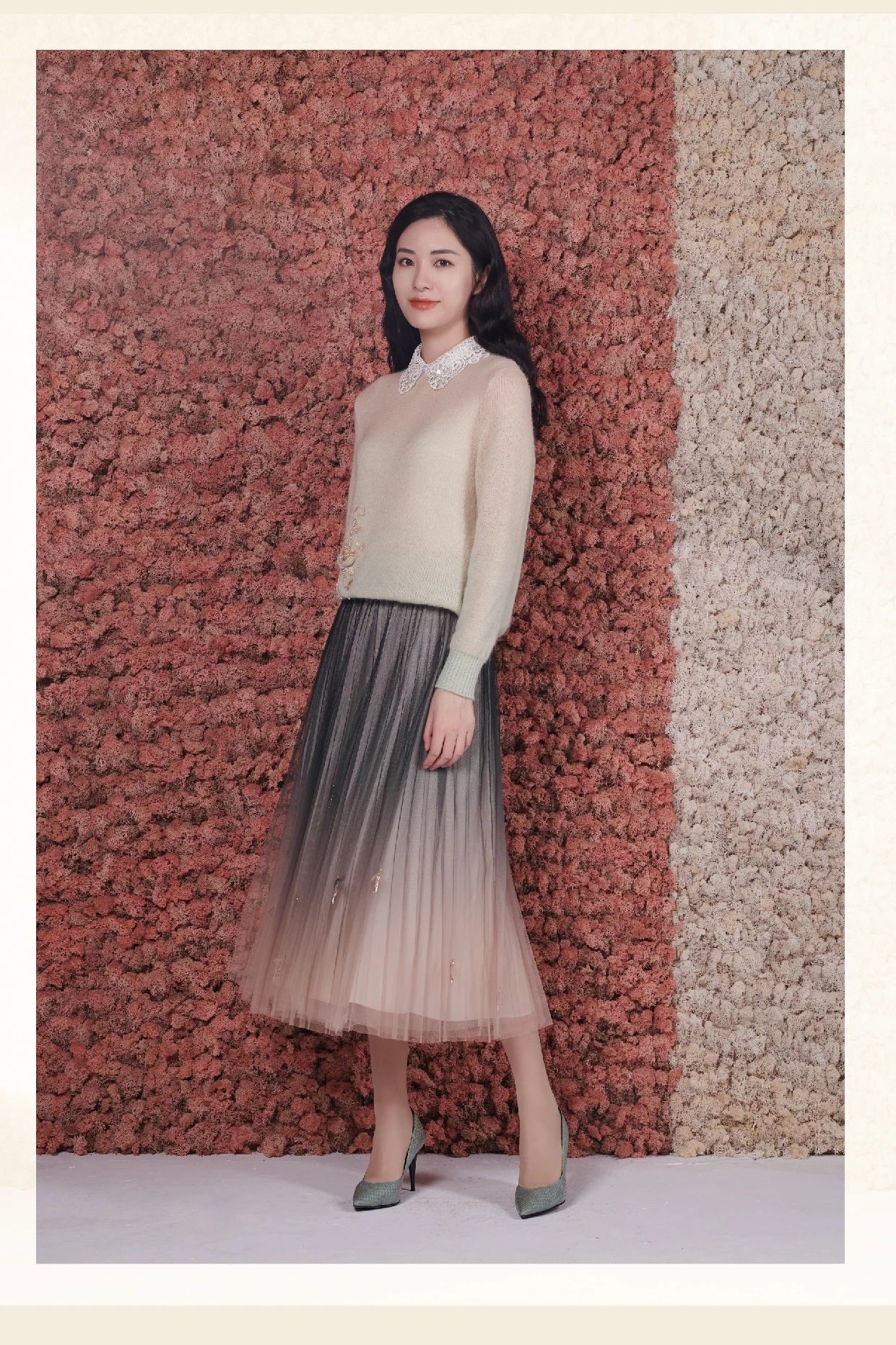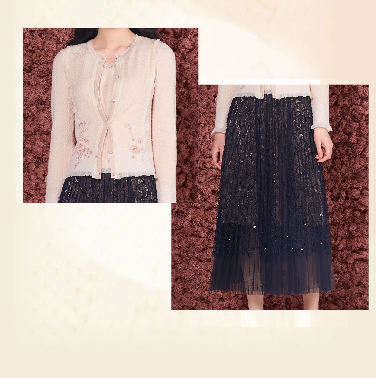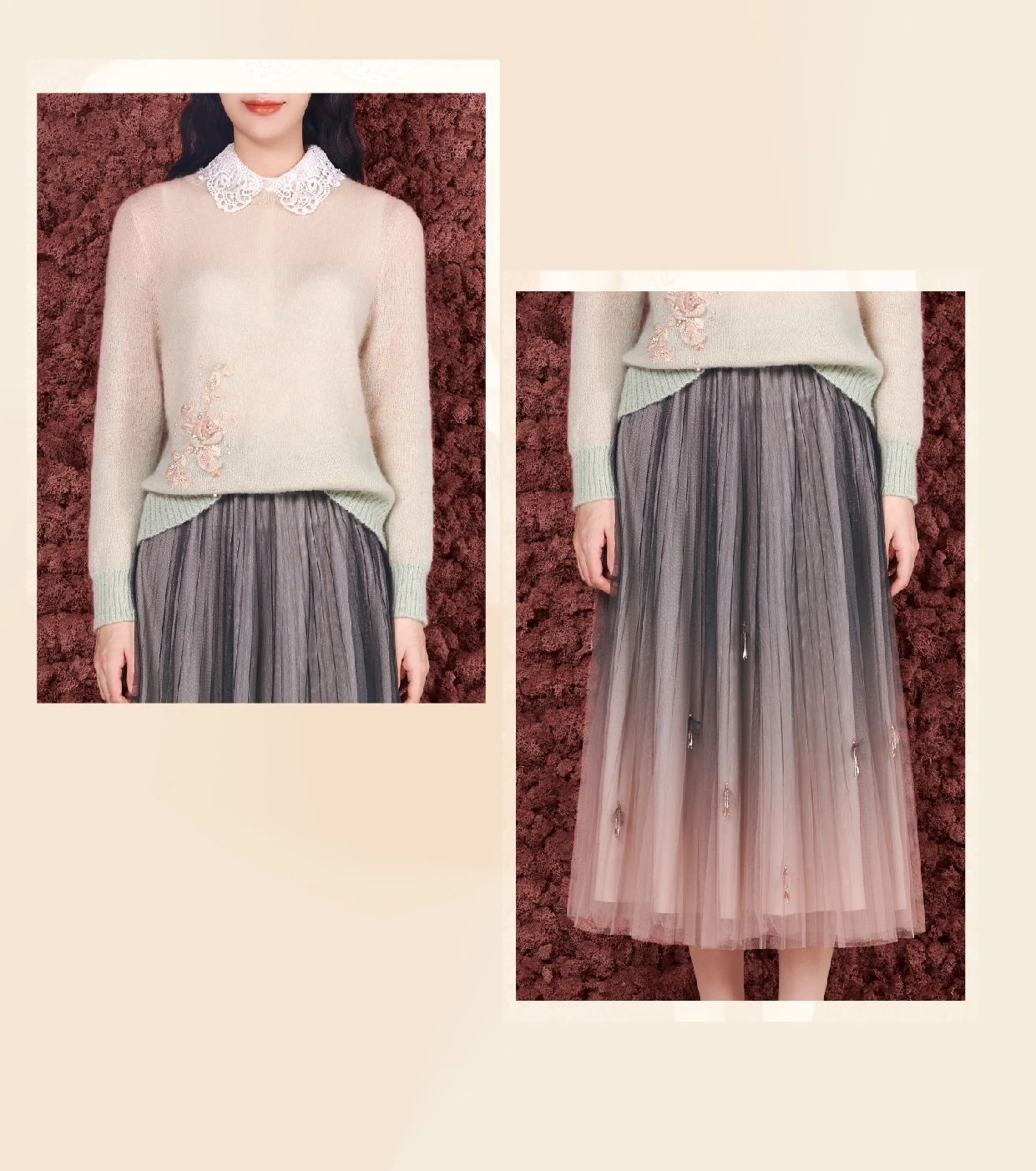 贴花钉珠及下摆和袖口的欧根纱边饰