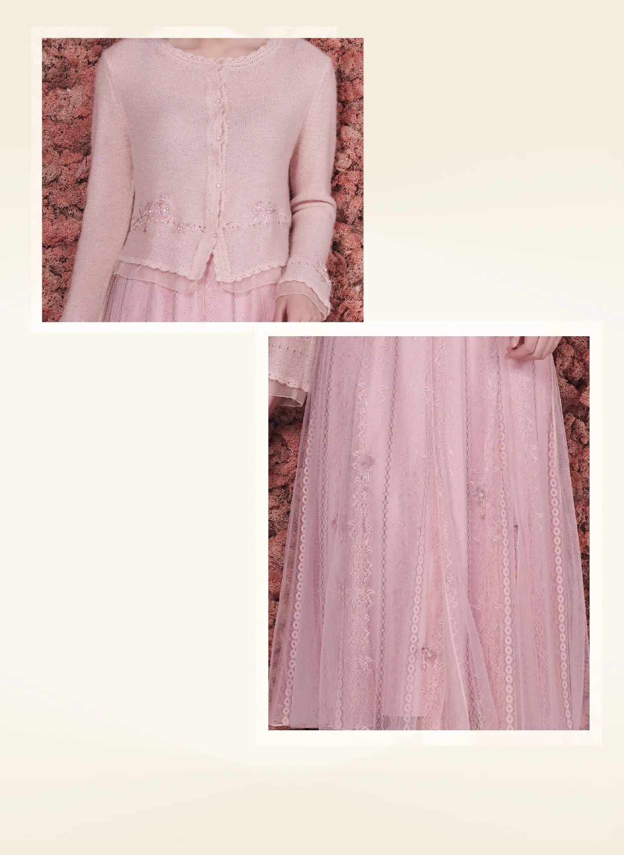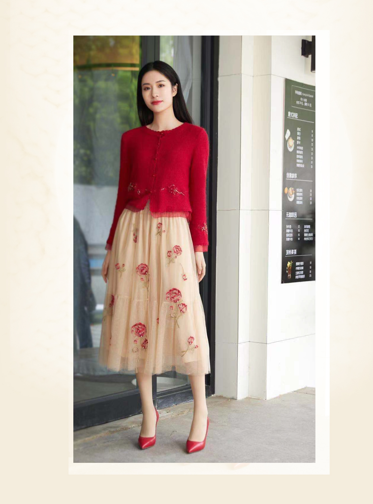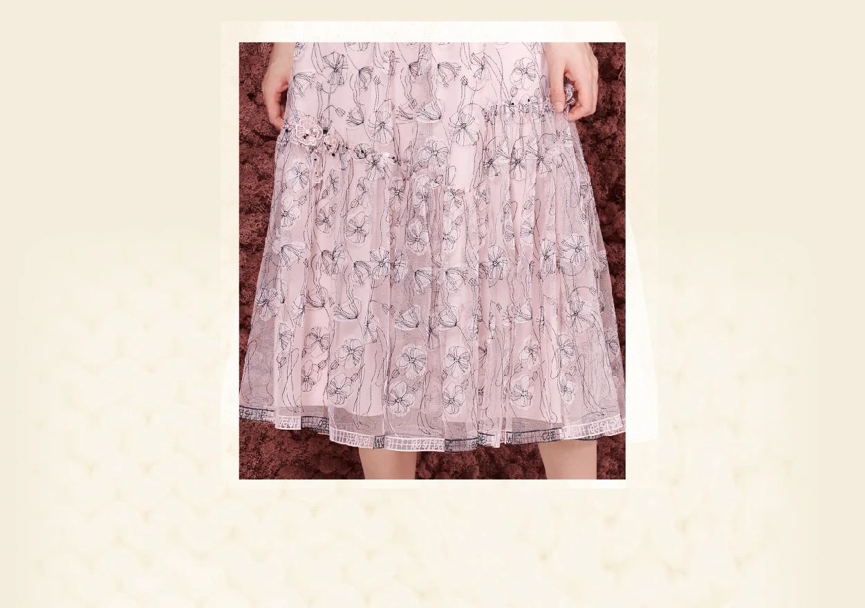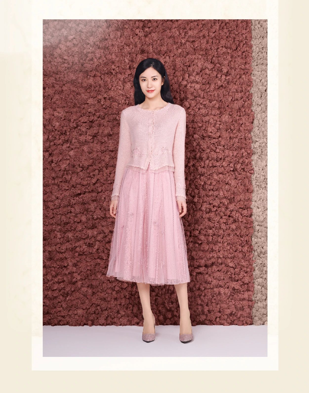 贴花钉珠及下摆和袖口的欧根纱边饰